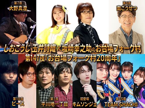 しおこうじのお台場フォーク村NEXT第147夜 お台場フォーク村20周年@フジテレビNEXT TEAMSHACHIは個々のメンバーは出ているはずだが、グループで出るのはいつ以来だろうかと思ったが、そうか割と最近*1アルフイーの超難関曲「幻夜祭」のカバーをしたような記…