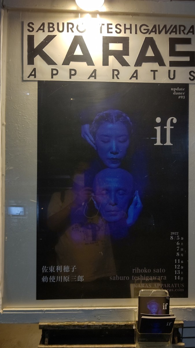 勅使川原三郎の公演にはこれまでもいろんな人が来場したはずだが、今回のように観客にわざわざ紹介するというのは私が観劇した中では初めてのことだが、わざわざ紹介したのは世界を代表する才能の死を追悼した後で、それと対峙するようにこれからのダンス界を背負っていく若い才能を紹介したのではないかと感じた。そして、それはどこまで意図的なものだったのかは分からないが、この日上演した「if」という作品の主題と呼応するようなところがあったのではないかと感じたのである。